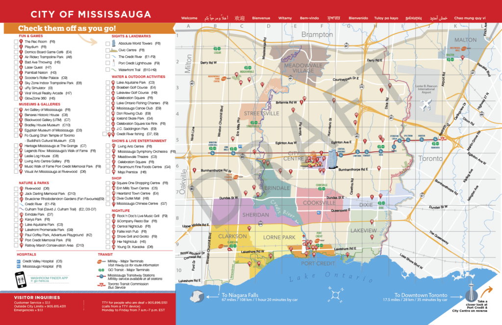 The City of Mississauga publishes an annual visitor guide showcasing local attractions. They distribute over 120,000 copies of the print version with the map on a tear-away page at the back of the guide. The guide is available on visitmississauga.ca as a PDF download.